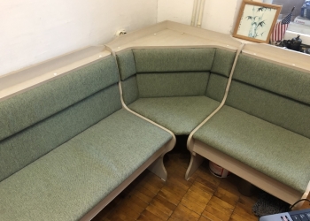 Кухонный мягкий уголок салатного цвета, 120х160, под сидениями ящики . Полка для радио или для цветов.